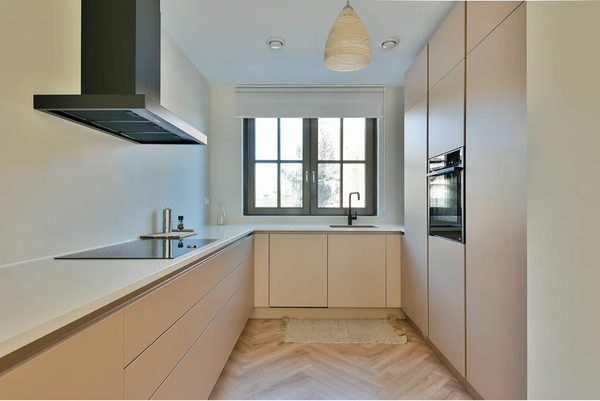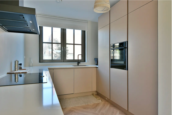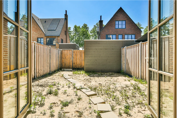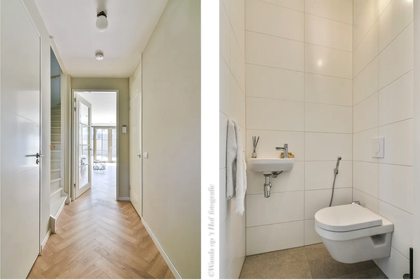 Begane grond: Entree met hal, meterkast, modern zwevend toilet met fonteintje en een kast met opstelplaats voor de warmtepomp. De lichte woonkamer beschikt over een praktische trapkast en openslaande deuren naar de achtertuin. De open keuken is uitgevoerd in een frisse, neutrale tint en uitgerust met diverse inbouwapparatuur: een inductiekookplaat, combi-stoomoven/oven, afzuigkap, koelkast met vriesvak en vaatwasser.