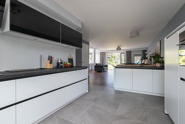 De open keuken heeft alle moderne inbouwapparatuur, zoals electrische kookplaat, vaatwasser, koelkast, diepvrieskast, magnetron en (stoom) oven. Tevens een eiland om aan te zitten in de keuken ligt een stenen vloer en in de woonkamer een houtenvloer.