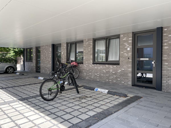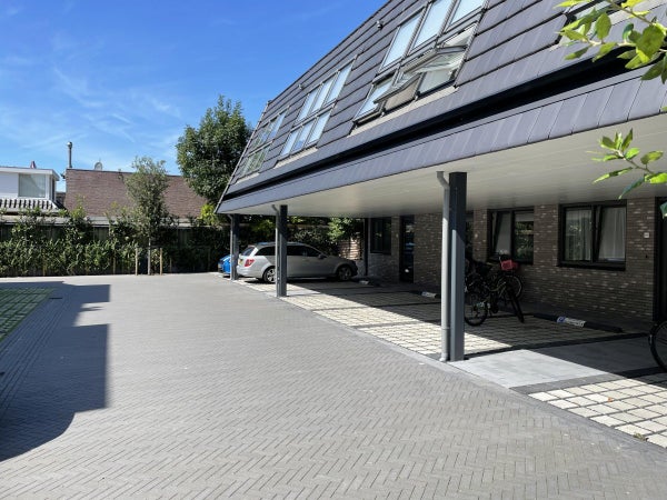 Aan de voorkant van de woning is er onder de overstek één privé parkeerplaats gelegen. Aan de zijkant van de woningen is er per woning toegang tot één privé (fietsen-)berging. Ook zijn hier de containers voor het afval te vinden.