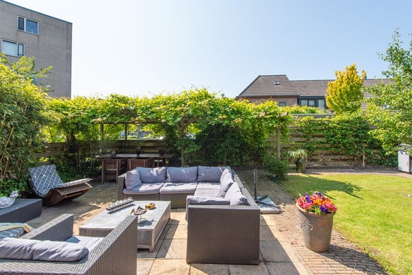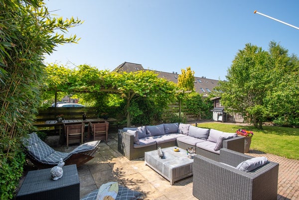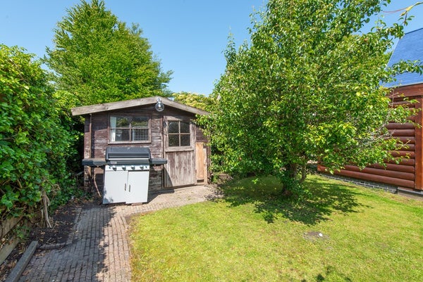 De woning beschikt over een ruime, zonnige tuin op het zuiden, rondom de woning gelegen. Hier is volop gelegenheid om te loungen, borrelen of dineren. Er is tevens een houten berging en een sfeervolle veranda in Amerikaanse stijl.