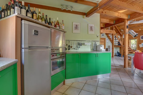 Aan de voorzijde bevinden zich twee eigen parkeerplaatsen en een inpandige garage met elektrische roldeur. Via de entree bereikt u de lichte hal met toegang tot de woonkamer. De royale living heeft een hoog plafond, grote ramen en openslaande deuren naar de zonnige tuin. De open keuken is compleet uitgerust met o.a. vaatwasser, kookplaat, koelkast, vriezer, oven en magnetron. Aansluitend vindt u een praktische bijkeuken met wasmachineaansluiting.