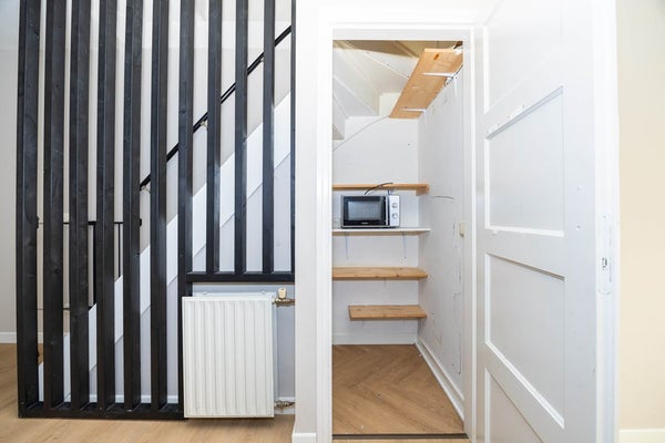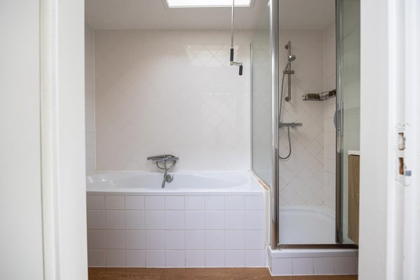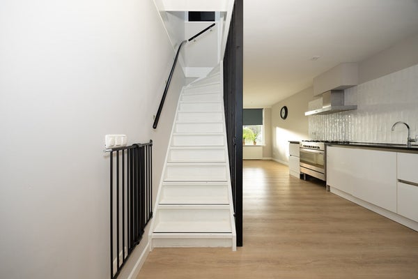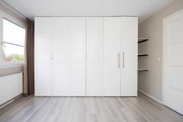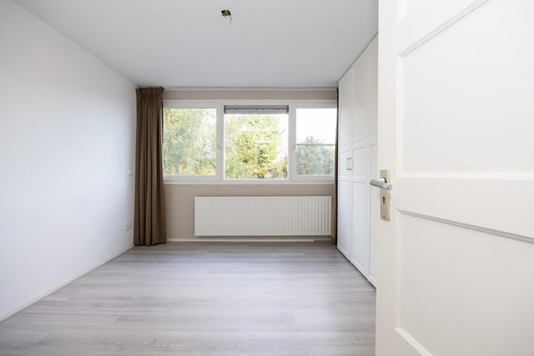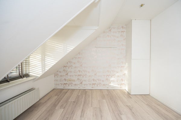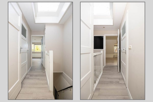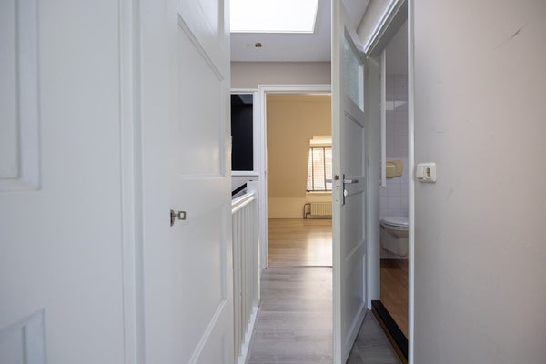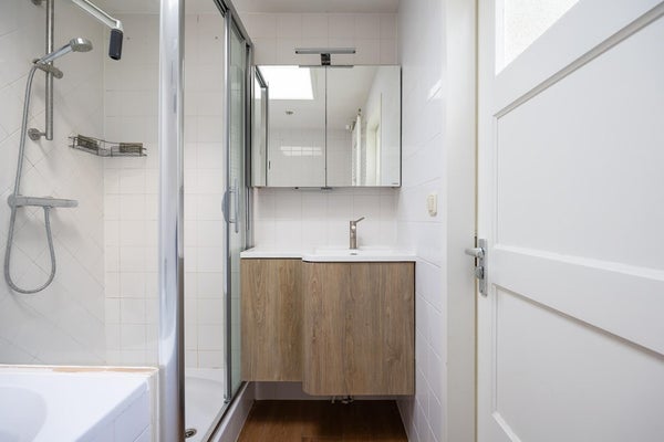 Met een vaste trap kom je op de verdieping met twee slaapkamers met veel lichtinval en strakke afwerking. De slaapkamer aan de voorkant is voorzien van een dakkapel en kijkt uit over de straat. De master-bedroom aan de achterzijde is ruim met voldoende plek voor een kledingkast en een tweepersoonsbed. Door de grote raampartij heb je hier veel licht met uitzicht over de tuin. Ook de moderne badkamer is keurig: fris wit betegeld met een ruime douche en wastafelmeubel. Het daglicht in het plafond zorgt voor licht en natuurlijke ventilatie.