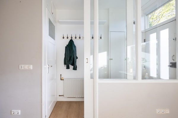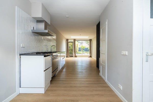 Bij binnenkomst valt direct de fijne sfeer op. De woning heeft een ruime hal, een doorzonwoonkamer met grote raampartijen en een houten vloer. De keuken is modern en strak uitgevoerd en voorzien van diverse inbouwapparatuur. Achterin bevindt zich een uitbouw met openslaande deuren naar de tuin: een fijne extra leefruimte, ideaal als eetkamer of thuiswerkplek.