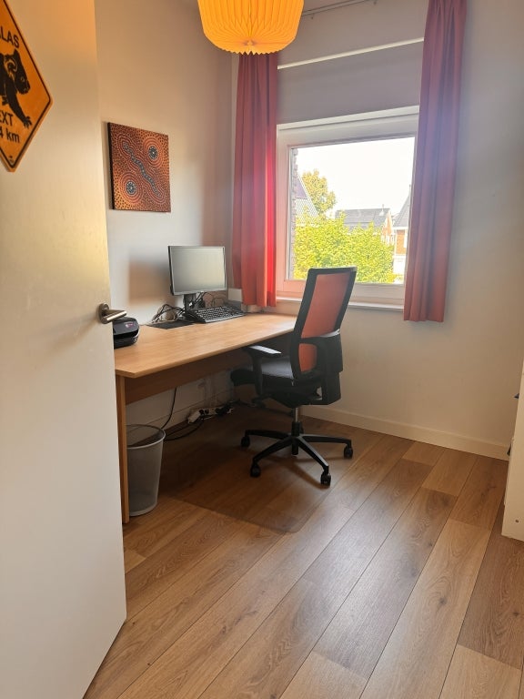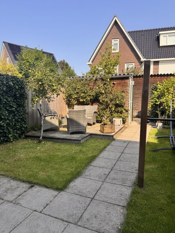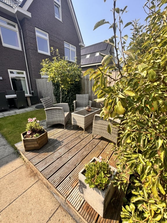 Ruime moderne lichte eengezinswoning met 4 slaapkamers, waarvan 1 in gebruik is als ruime werkkamer. Moderne keuken met diverse inbouwapparatuur, luxe badkamer en riante achtertuin met berging.