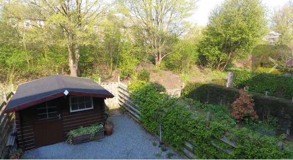 De achtertuin grenst aan een groenstrook, beschikt over een tuinberging en is bereikbaar via een achterom.