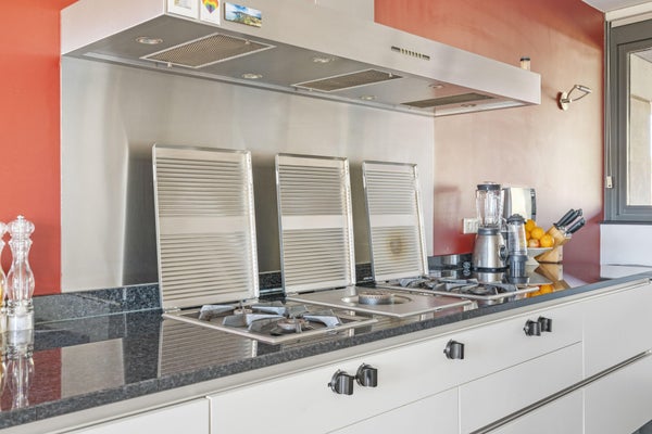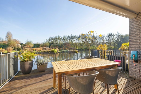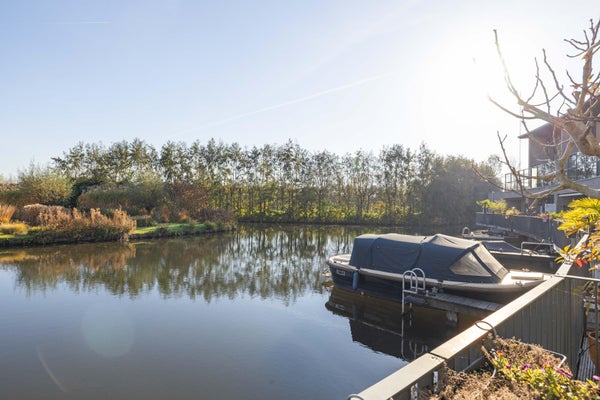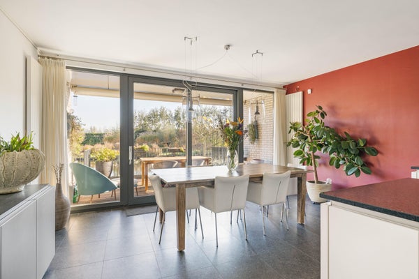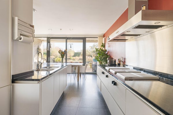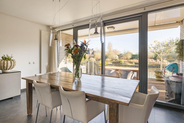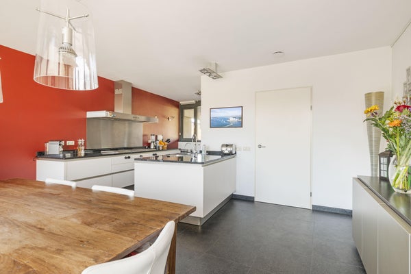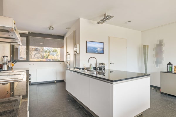 De keuken is voorzien van een vloerverwarming en is volledig uitgerust met o.a. een inbouw kookplaat welke is voorzien van vier gaspitten en een wokbrander, vaatwasser, koelkast, vriezer, oven en een stoomoven. Vanuit de eetkamer geven grote schuifdeuren toegang tot het eerste terras waar je heerlijk buiten kunt zitten met daarbij een steiger met aanlegplaats.