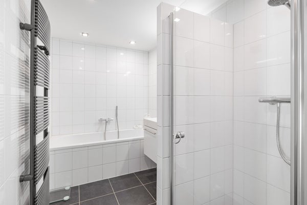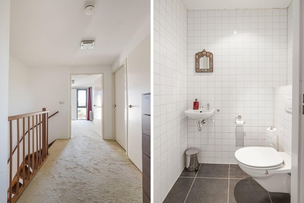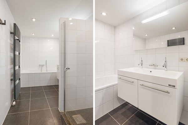 Centraal ligt de badkamer, voorzien van ligbad, douche en wastafel. Daarnaast is er een separaat toilet op de overloop en een wasruimte met een wasmachine.