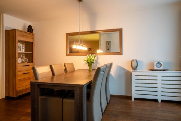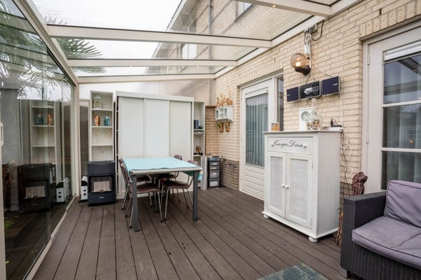 Aan de voorzijde bevindt zich het sfeervolle zitgedeelte, met uitzicht over de groenstrook en de straat. Aan de achterzijde ligt het eetgedeelte, grenzend aan de moderne keuken. Vanuit hier heb je toegang tot de serre, waar je heerlijk kunt ontspannen met uitzicht op de tuin.