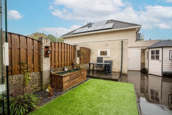 De achtertuin beschikt over een stenen berging met elektra én een extra tuinhuisje, ideaal voor opslag of hobbyruimte.