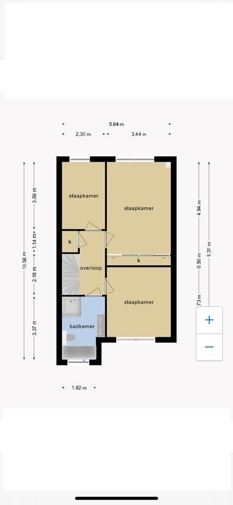De ruime overloop biedt toegang tot drie slaapkamers en de badkamer. Twee slaapkamers liggen aan de achterzijde (waarvan één de ouderkamer met vaste kast) en één slaapkamer aan de voorzijde.