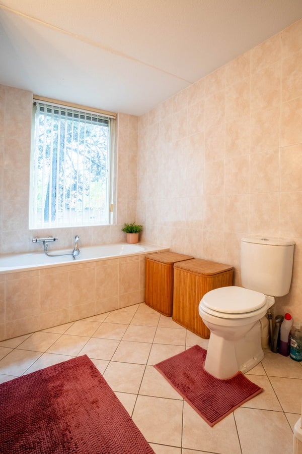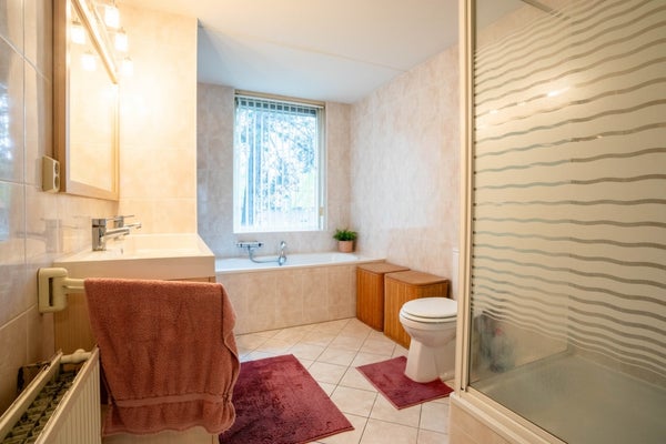 De volledig betegelde badkamer is royaal en voorzien van een ligbad, douchecabine, zwevend toilet en een dubbele wastafel met meubel.
