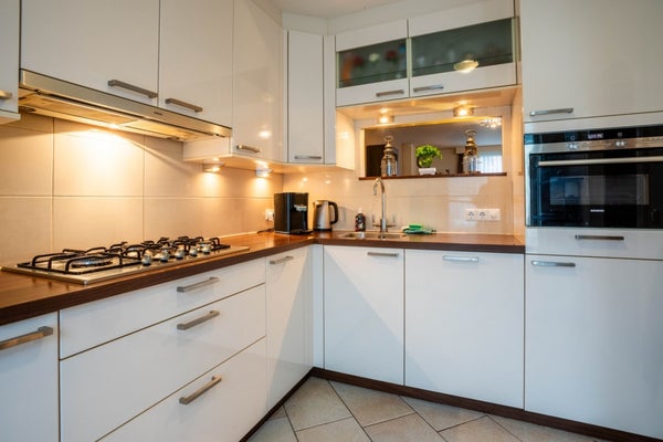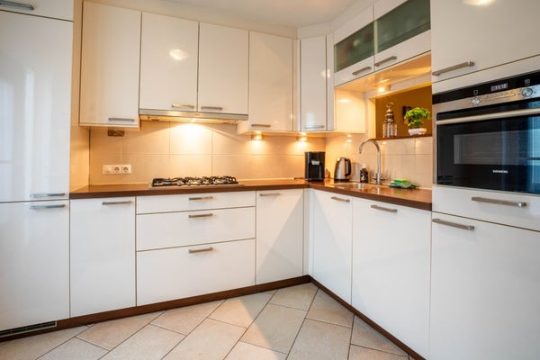 De keuken is voorzien van diverse inbouwapparatuur, waaronder een vaatwasser, 5-pits gasfornuis, combi-magnetron, afzuigkap, spoelbak, koelkast en meerdere opberglades en -kasten.