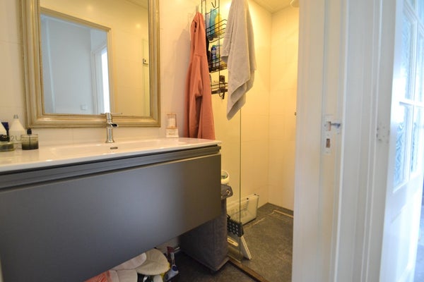 Op de begane grond bevinden zich ook het aparte toilet en de badkamer. De badkamer beschikt over een inloopdouche en een wastafelmeubel met lades.