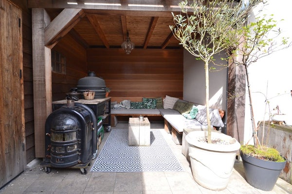 De tuin ligt heerlijk op de zon en is ingericht met een gezellige veranda, een ruime schuur en onderhoudsvriendelijke bestrating. Een fijne plek om buiten te zitten, te ontspannen of te klussen.