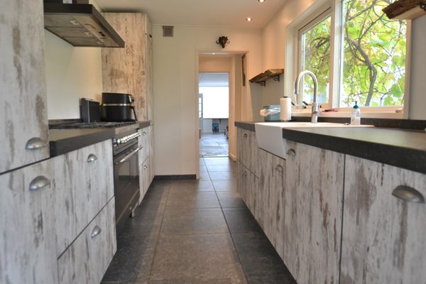 Achter de keuken ligt de bijkeuken. Hier is een nette kast met schuifdeuren geplaatst, waarin de wasruimte is ondergebracht.