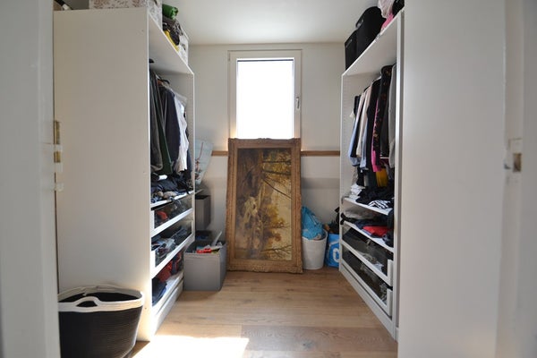 Via de trap in de hal komt u op de overloop. Hier is een praktische inloopkast gerealiseerd, evenals de toegang tot de vliering, een ideale plek voor extra opbergruimte.
