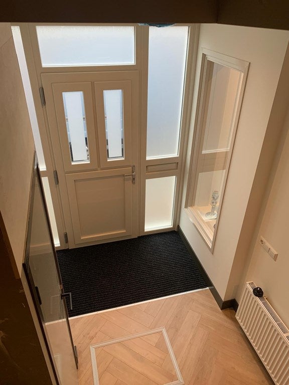 Entree woning met royale hal: meterkast, ruime kelderkast, toilet en trapopgang. Vanuit de hal loopt u de woonkamer in welke een prachtige houten visgraatvloer heeft, een open keuken en openslaande deuren naar de achtertuin zuidoosten. De grote raampartijen zorgen voor een heerlijke lichte woonkamer.