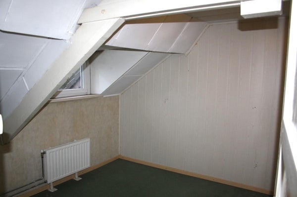 Overloop. 1 slaapkamer (3.07 x 2.97) met dakraam. Bergruimte.
