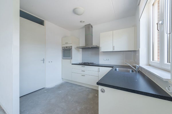 De semi-open keuken is voorzien van een strakke en moderne witte installatie in hoekopstelling, inclusief een 4-pits gaskooktoestel, RVS‑afzuigkap, koelkast, oven en vaatwasser.