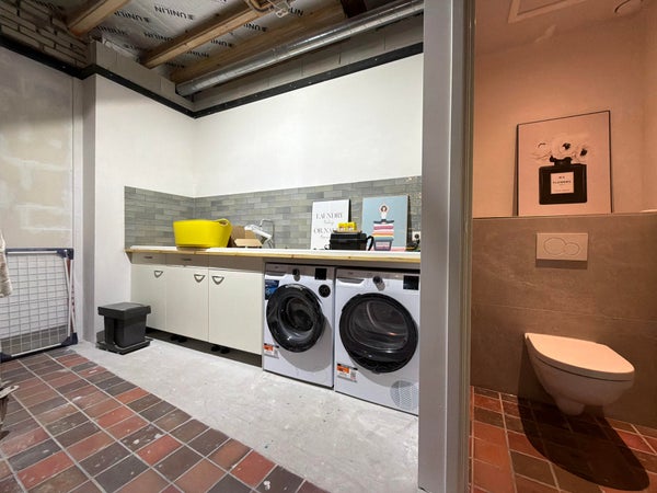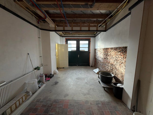 Bij binnenkomst treft u een nette hal met directe toegang tot de ruime garage van ca. 60 m². Deze garage biedt plaats aan één tot zelfs twee auto’s en is daarnaast voorzien van een wasmachine, droger, wastafel en toilet – een bijzonder praktische en zeldzame luxe in de binnenstad.