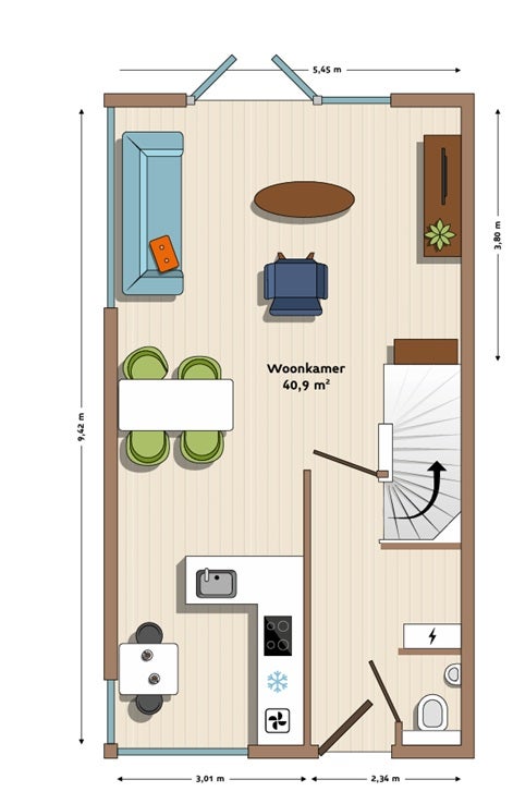 Bij binnenkomst komt u in de ruime hal met aan de rechterzijde het vrij hangende WC met fontein. Vanuit de hal begeeft u zich in de woonkamer/keuken.