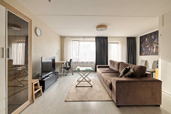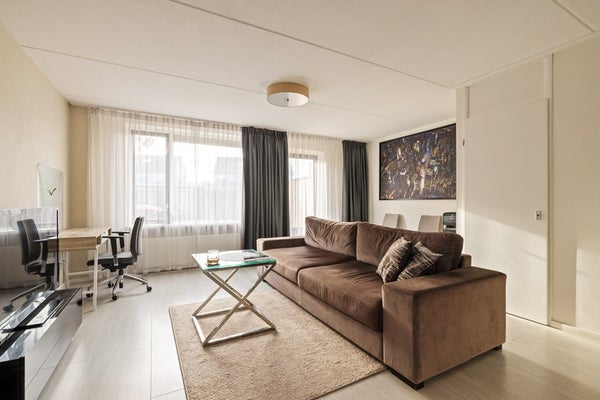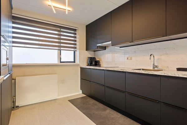 Bij binnenkomst valt meteen de lichte en open indeling op. De woonkamer is warm ingericht met een comfortabele zithoek en eethoek, en biedt directe toegang tot de ruime achtertuin van circa 45 m². De moderne keuken is voorzien van diverse inbouwapparatuur en beschikt over voldoende kastruimte.