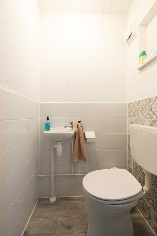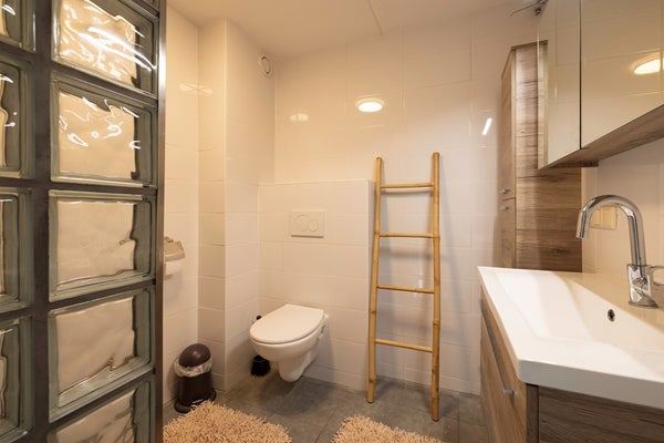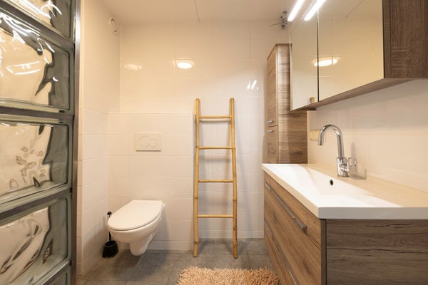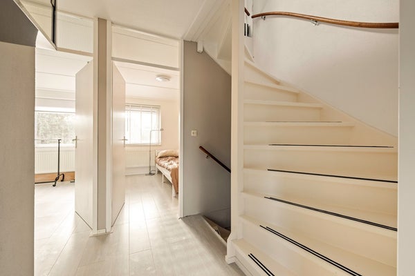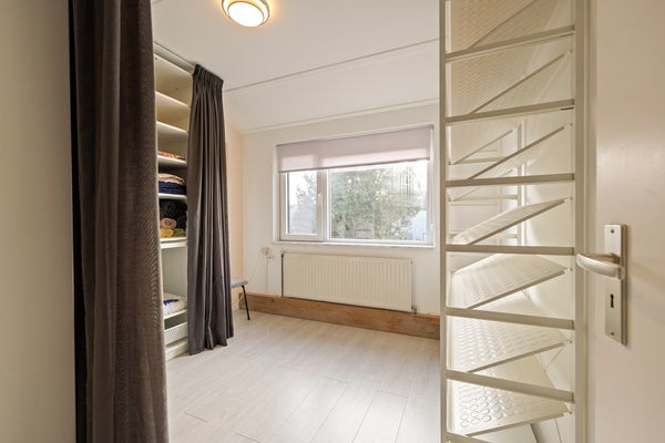 Op de eerste verdieping bevinden zich drie goed ingedeelde slaapkamers. Eén van de kamers is ingericht als stijlvolle walk-in closet, terwijl de andere twee perfect zijn als slaap- of werkkamer. De nette badkamer is voorzien van een douche en wastafel.