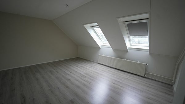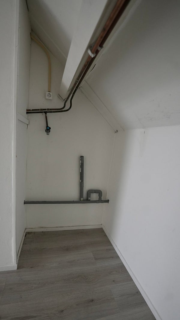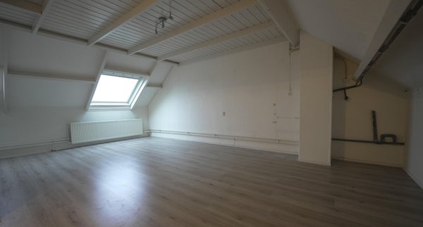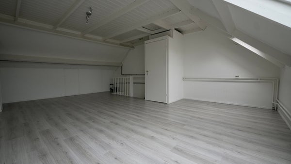 Grote zolderkamer met laminaatvloer, opstelplaats voor wasmachine en droger, en de cv-ketel. Ideaal als vierde slaapkamer, werk- of hobbyruimte.