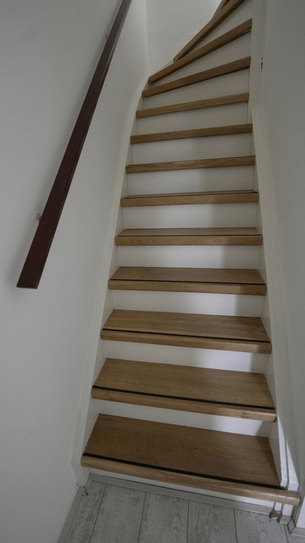 Overloop met toegang tot drie ruime slaapkamers (ca. 17 m², 11,5 m² en 7,5 m²), allen voorzien van laminaat. Twee slaapkamers hebben toegang tot het balkon op het zuiden. De moderne badkamer (2023) is uitgerust met een douche, wastafelmeubel, tweede toilet en designradiator. Via een vaste trap bereikt u de tweede verdieping.