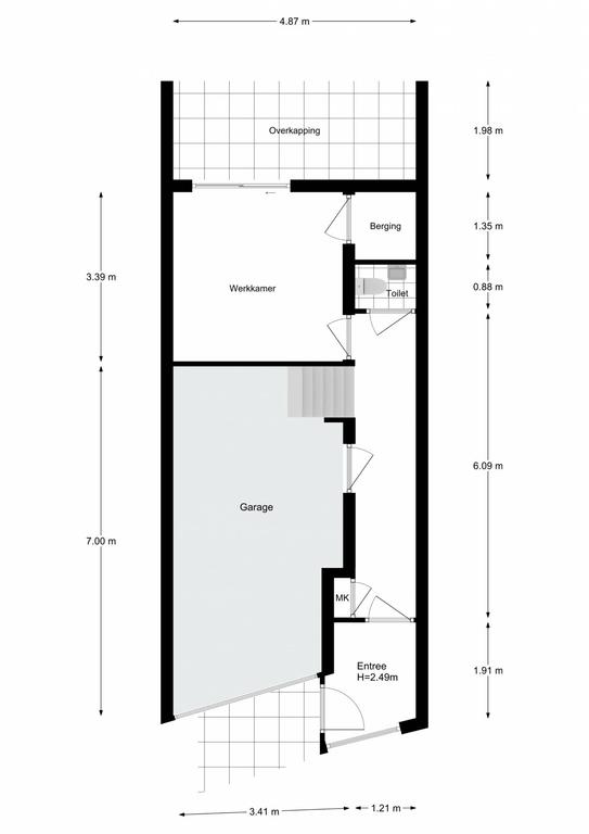 Entree met hal, meterkast en toegang tot de inpandige garage van ca. 23 m². Tevens bevinden zich hier een toilet met fonteintje, een (slaap)kamer van ca. 3,45 x 3,60 meter met toegang tot de op het zuidoosten gesitueerde tuin. Daarnaast is er een vaste kast met de opstelling voor de cv-ketel, mechanische ventilatie en tevens wasmachine.