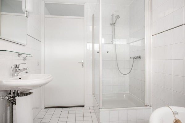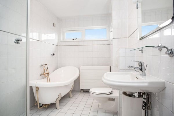 Overloop met lichtkoepel, toegang tot de tweede en derde slaapkamer, en de volledig betegelde badkamer voorzien van een separate douchehoek, vrij hangend toilet, een stijlvol bad op pootjes en een wastafel.