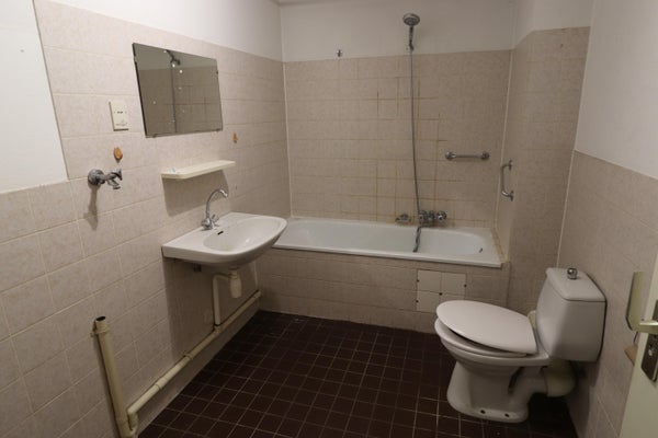 Overloop, 3 slaapkamers, badkamer met ligbad, wastafel, toilet en wasmachine-aansluiting.
