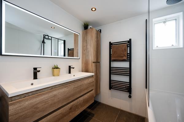 Op deze verdieping vind je ook de nieuwe badkamer. Hier waan je je in luxe, compleet met een comfortabel ligbad, tweede toilet, design wastafelmeubel, een spiegel met verlichting en verwarming én een handdoekradiator.