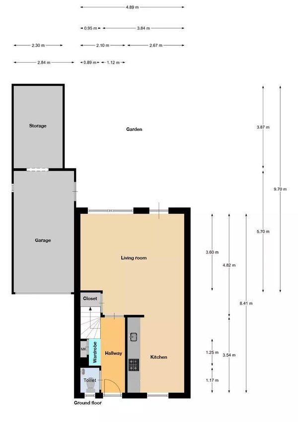 Aan de voorzijde vind je de ruime keuken. Deze is van alle gemakken voorzien voor als je van koken houdt: een vaatwasser, oven, koelkast, kookplaat en veel kastruimte. Vanuit de woonkamer stap je zo de diepe achtertuin in. Een heerlijke plek voor een zomerse barbecue! De aangebouwde garage aan de zijkant biedt je alle ruimte voor je auto, fietsen of opslag.