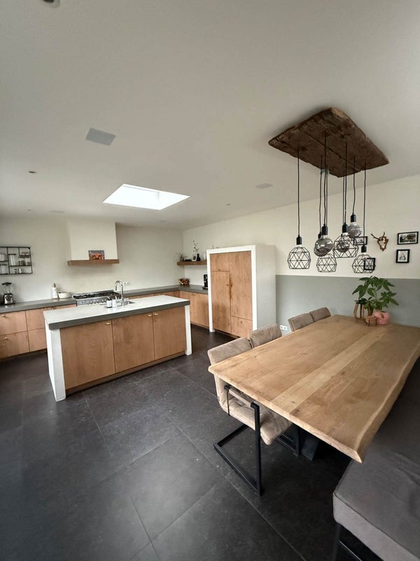 Via de entree kom je in de hal waar zich ook een toilet, kelder, een (diepe) kast en een kast waar de wasmachine en droger zijn opgesteld, bevinden. De hal biedt toegang aan de ruime woonkeuken en de heerlijk lichte woonkamer. De luxe keuken is ruim opgezet en van alle gemakken voorzien, o.a. een groot kookeiland, koel-/vriescombinatie, vaatwasser, 6-pits gasfornuis met oven en een quooker. Tevens staat er een gezellige grote eettafel met 8 stoelen waar heerlijk geborreld en gegeten kan worden.