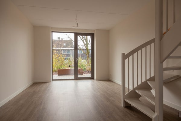 De woonkamer ligt aan de achterzijde van de woning en biedt via een schuifpui toegang tot de compacte tuin.