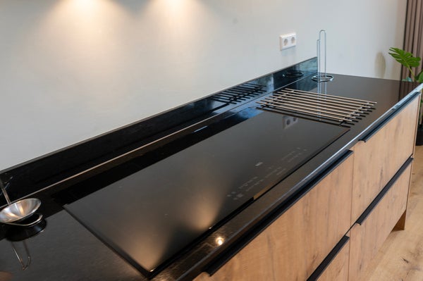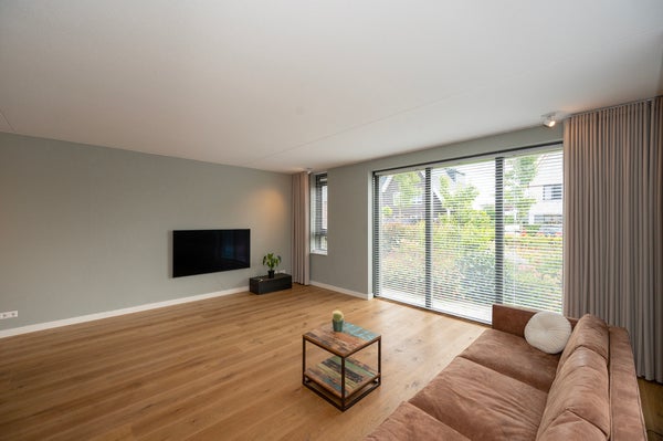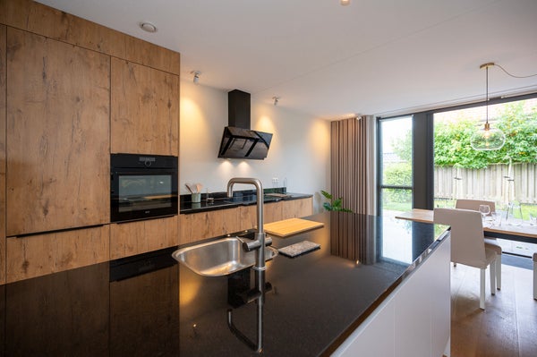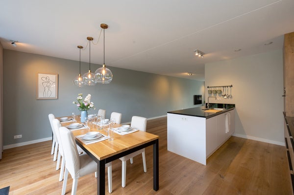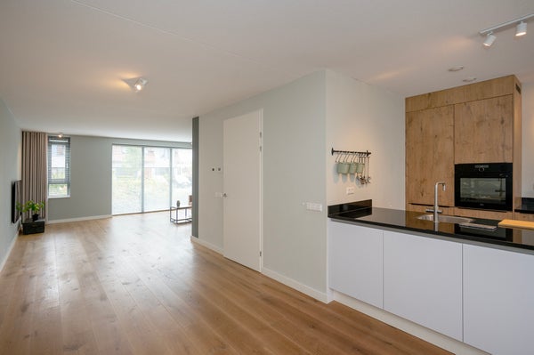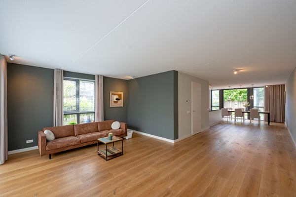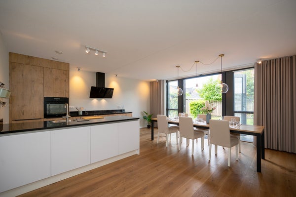 Bij binnenkomst betreedt u een ruime hal die toegang biedt tot de royale woonkamer en de trap naar de eerste verdieping. Tevens bevindt zich hier een separaat toilet. De woonkamer is voorzien van een parketvloer en grote ramen, waardoor veel natuurlijk licht binnenvalt. Aan de achterzijde van de woning bevindt zich de moderne open keuken met een grote eettafel. De keuken is uitgerust met hoogwaardige inbouwapparatuur, waaronder een luxe 5-pits inductiekookplaat, stoomoven, heetwaterkraan, koelkast en dubbele vriezer, afzuigkap, vaatwasser en voldoende kastruimte. Via de openslaande deuren is de riante tuin bereikbaar. Aan de voorzijde van de woning bevindt zich een gezellige zithoek met bank en tv.