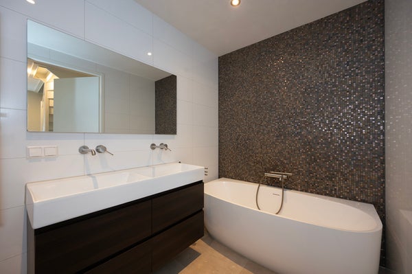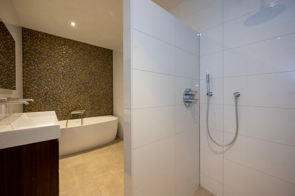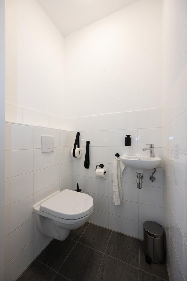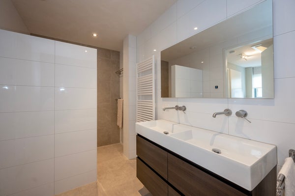 Op de eerste verdieping bevinden zich drie slaapkamers, waaronder een ruime masterbedroom met tweepersoonsbed en grote kledingkast. De andere twee kamers zijn netjes afgewerkt en multifunctioneel te gebruiken, bijvoorbeeld als slaapkamer, werkkamer of studeerkamer. De badkamer is luxe uitgerust met een ligbad, inloopdouche en dubbele wastafel met meubel. Er is ook een separaat toilet op deze verdieping aanwezig.