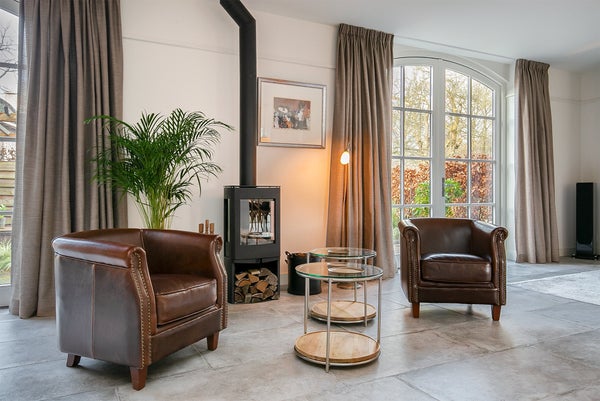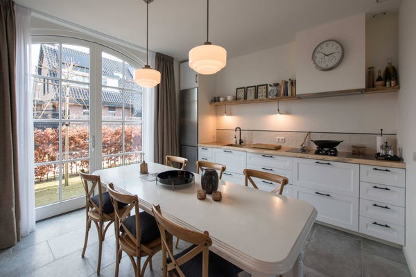 INDELING De woning ligt aan een rustig, doodlopend zijstraatje van de Nieuw-Loosdrechtsedijk, met als bijzondere buren het Kasteel-Museum Sypesteyn. Aan het einde van het straatje zijn twee eigen parkeerplekken beschikbaar. Via de bestrate voortuin bereik je de voordeur. Vanuit de ruime hal zijn het separate toilet, de trapkast, woonkamer en trap naar de eerste verdieping te bereiken. Aan de linkerzijde van de brede, luxe woonkamer is de gezellige zithoek met o.a. een grote hoekbank en televisie met Sonos soundbar. Centraal in de woonkamer staan twee fauteuils, rond de houtkachel en tegenover de piano. Aan de rechterzijde van de woonkamer staat een wandvullende (boeken)kast en is de toegang tot de halfopen, speelse eetkeuken aan de voorzijde van de woning. Deze originele ruimte heeft aan twee kanten een keuken en in het midden een eettafel. Aan de linkerkant staat o.a. een vaatwasser, koelkast, combi-oven, koffiemachine, spoelbak en veel opbergruimte. Rechts staat een nog grotere koelkast met vriezer, zijn er drie kookplaten (gas én inductie) en ook hier is voldoende opbergruimte en wederom een spoelbak. Aan de muur hangt nog een kleine tv. De openslaande deuren in de keuken bieden toegang tot de voortuin.