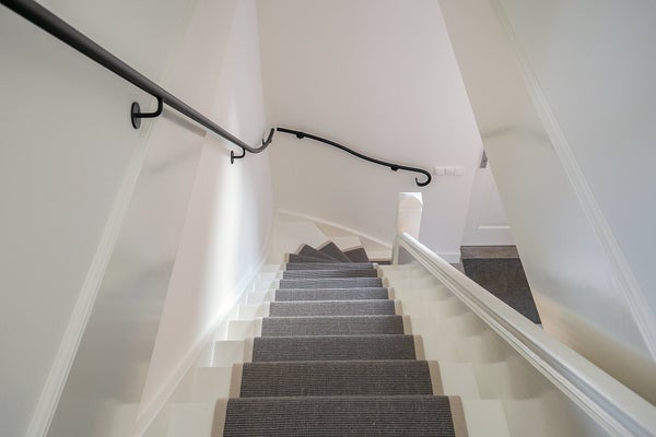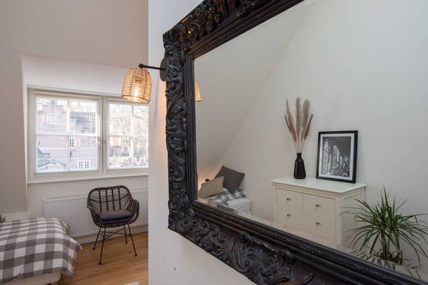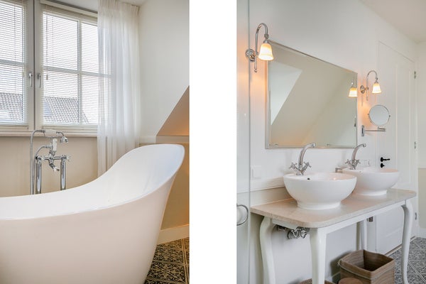 Op de eerste etage bereik je via de overloop de twee slaapkamers, badkamer en wasruimte. De wasruimte is verborgen achter twee deuren en voorzien van een wasmachine en droger. De stijlvolle badkamer is voorzien van een vrijstaand ligbad, douche, dubbele wastafel en toilet. De grote master bedroom beslaat de gehele diepte van de woning, met ramen aan zowel de voor- als de achterkant. De slaapkamer is voorzien van een 200x200 cm tweepersoonsbed, linnenkast en aan beide kanten inbouwkasten met volop ruimte voor kleding. Omdat de kamer oorspronkelijk als twee slaapkamers ontworpen is, zijn er twee toegangsdeuren vanuit de overloop. De L-vormige tweede slaapkamer is voorzien van twee eenpersoonsbedden, een wastafel en een lichtkoepel en heeft mooi, vrij uitzicht over de kasteeltuin.