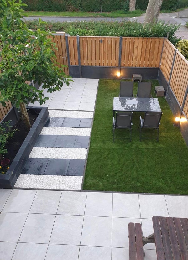 Grote zonnige goed onderhouden tuin met schaduw en tafel en stoelen