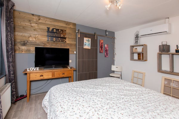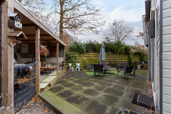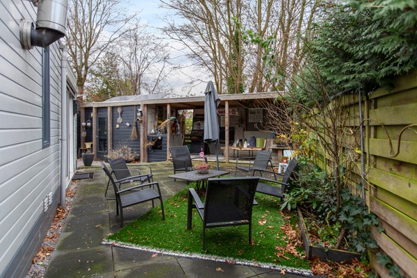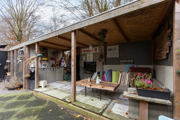 Voor de woning bevindt zich een compacte voortuin met een eigen parkeerplaats en een handige houten opbergschuur. Aan de achterzijde vindt u een ruime tuin die rondom de woonkamer en keuken loopt, welke over een tweede opbergschuur beschikt. De achtertuin is volledig ingericht voor comfort en ontspanning. Hier staan zes comfortabele relaxstoelen, een ligbed en buitenkinderstoelen, samen met een eettafel en stoelen voor gezellige diners in de buitenlucht. Onder de houten overkapping kunt u tot in de late zomeravonden genieten van de knusse loungebank, compleet met een aangesloten TV voor extra gemak en vermaak.