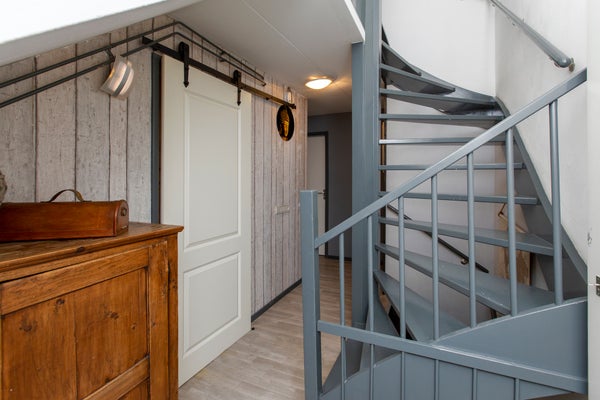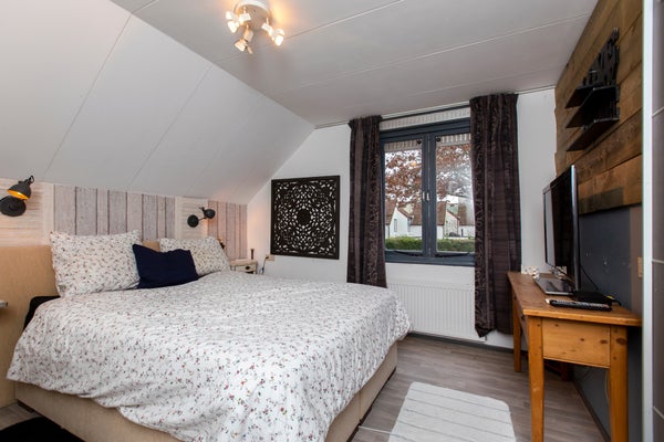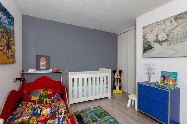 Wanneer u de trap opgaat komt u op de overloop die toegang biedt tot drie slaapkamers en de badkamer. De master bedroom is ingericht met een tweepersoonsbed, een ingebouwde kledingkast, een bijzettafel met televisie en wandmeubels waar u decoraties of foto's kunt plaatsen om uw slaapkamer persoonlijk aan te kleden. De tweede slaapkamer beschikt over een tweepersoonsbed en een ruime PAX-kledingkast. De derde slaapkamer is een kinderkamer, ingericht met een baby- en kinderbed en een speelkleed met een autoweg waar kinderen eindeloos plezier kunnen hebben. Een grote ingebouwde kledingkast biedt volop opbergruimte voor kleding en speelgoed. Verder staan er een ladekast, bijzettafel, kinderstoel en kruk in de kamer. Ook hangt er aan de muur decoratie. De stijlvol en robuust afgewerkte badkamer is uitgerust met een modern stenen wastafelmeubel, een ruime inloopdouche met regendouche en een luxe whirlpool. Daarnaast bevindt zich op deze verdieping een apart toilet, wat extra comfort biedt.
