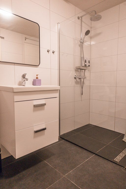 De woning beschikt over twee comfortabele slaapkamers en een moderne badkamer met ruime regendouche en wastafel.