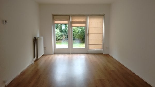 - Doorzon woon-/ eetkamer met laminaat vloer en openslaande deuren naar de tuin.