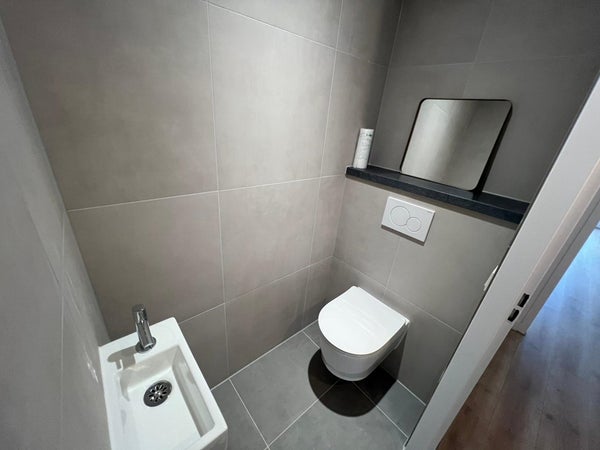 Nieuwe badkamer met ligbad, douchecabine, tweede toilet en wastafelmeubel.