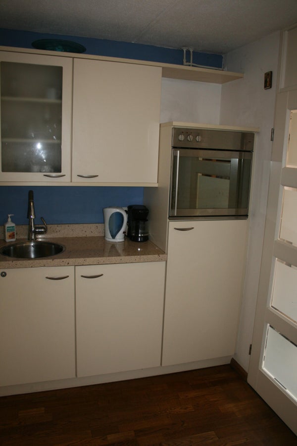 Hal met toilet, lichte woonkamer (ca. 30 m²) voorzien van een mooie nieuwe hoekbank en een open keuken (ca. 7 m²). De keuken is uitgerust met een spoelbak, 4-pits elektrische kookplaat, koelkast met vriezer, oven en vaatwasser. Vanuit de woonkamer is er toegang tot de tuin (ca. 30 m²) en de privé garage (ca. 16 m²). - Eerste etage