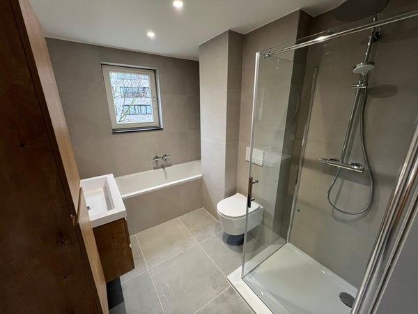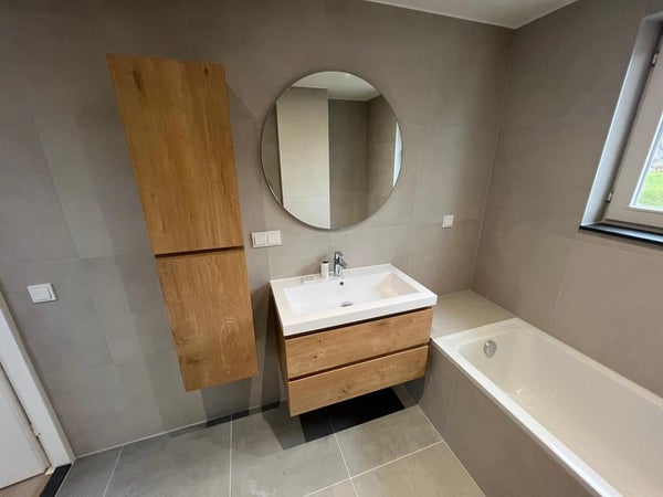 Nieuwe badkamer met ligbad, douchecabine, tweede toilet en wastafelmeubel.