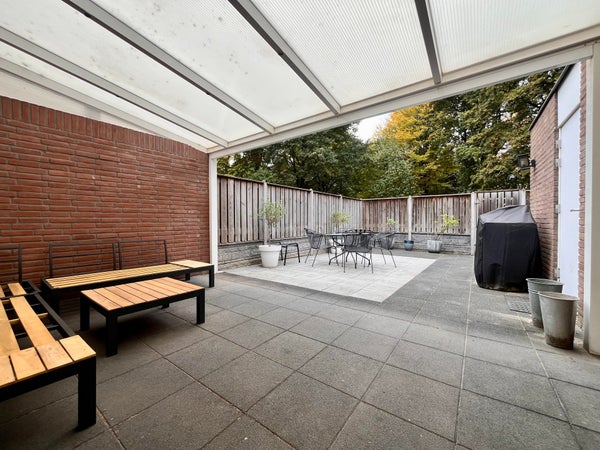 Ruime betegelde tuin (46m2) met een tuinberging. Mogelijkheid voor fietsen te stallen en verdere opslag.