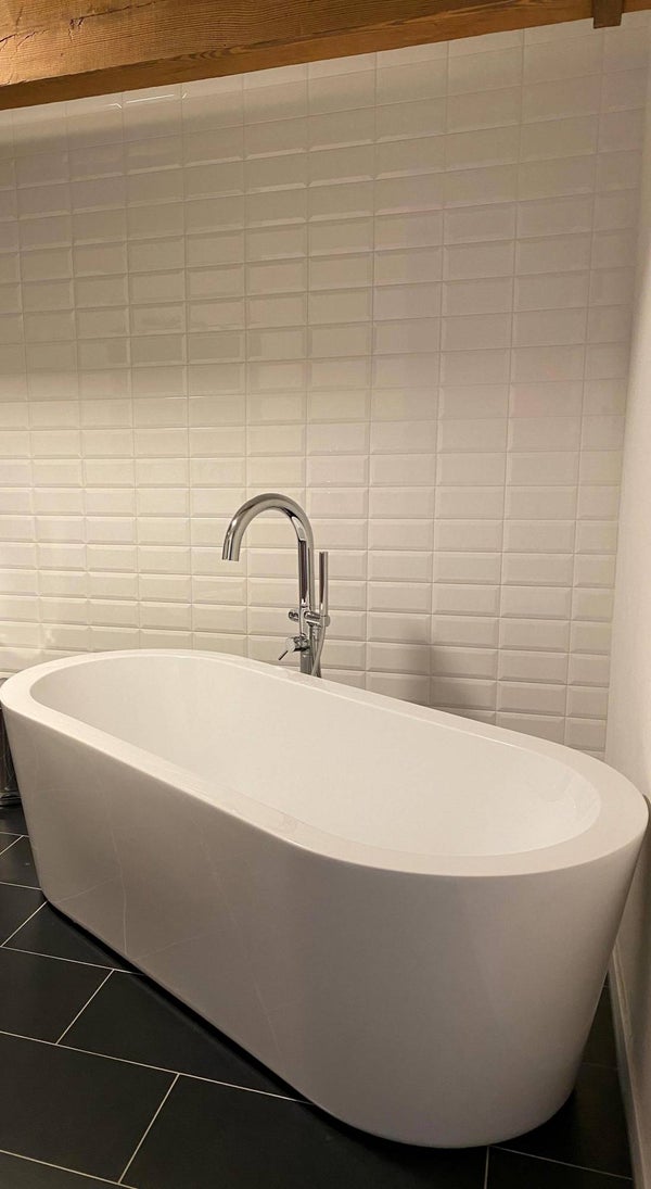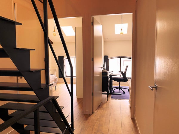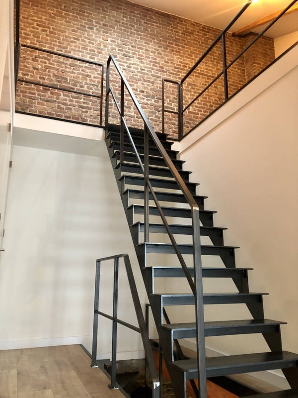 Via de stalen trap bereikt u de eerste verdieping. Hier bevinden zich twee slaapkamers met veel lichtinval (14 m² en 10 m²), een ruime berging (4 m²) met witgoedaansluiting, een separaat toilet en een badkamer (8 m²) met ligbad, aparte douche en dubbele wastafel.